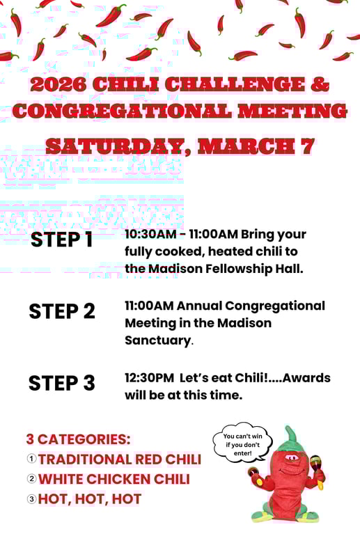 Mark your calendars for our Annual Chili Challenge & Congregational Meeting on Saturday, March 7th (note: this will be held on a Saturday this year) at the Madison Campus.