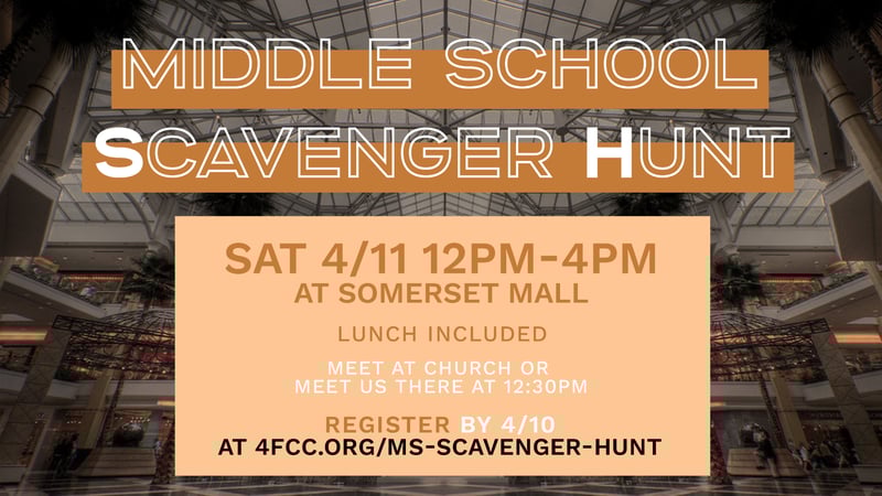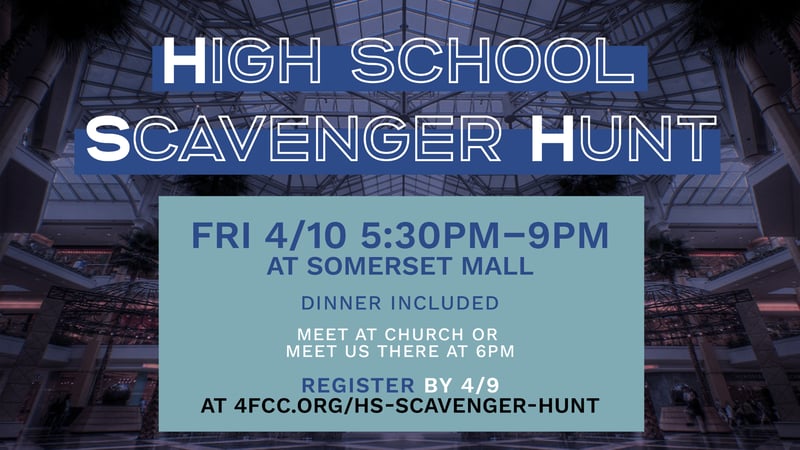 We’re thrilled to invite our High School group to an exciting Scavenger Hunt Adventure at Somerset Mall! Lunch will be provided from Chick-fil-A.