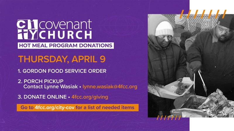 City Covenant Church is serving 800 hot meals a week in their community in Detroit. They partner with Forgotten Harvest, but have many other needs to supplement the meals as well as cleaning & hygiene items.