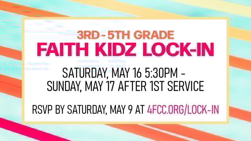 3rd, 4th and 5th grade Faith Kidz are invited to spend the night at church with their Sunday teachers for a LOCK-IN!